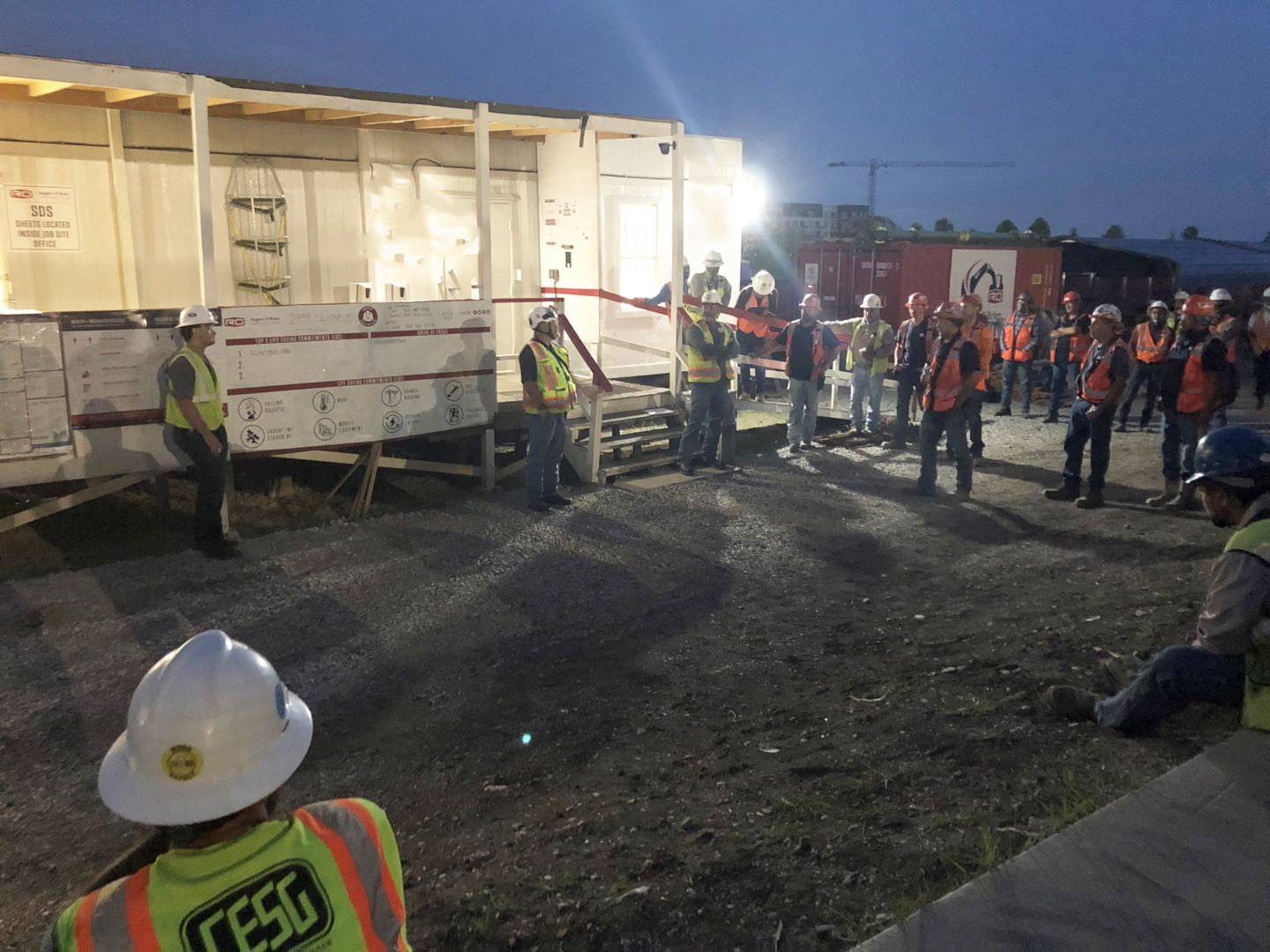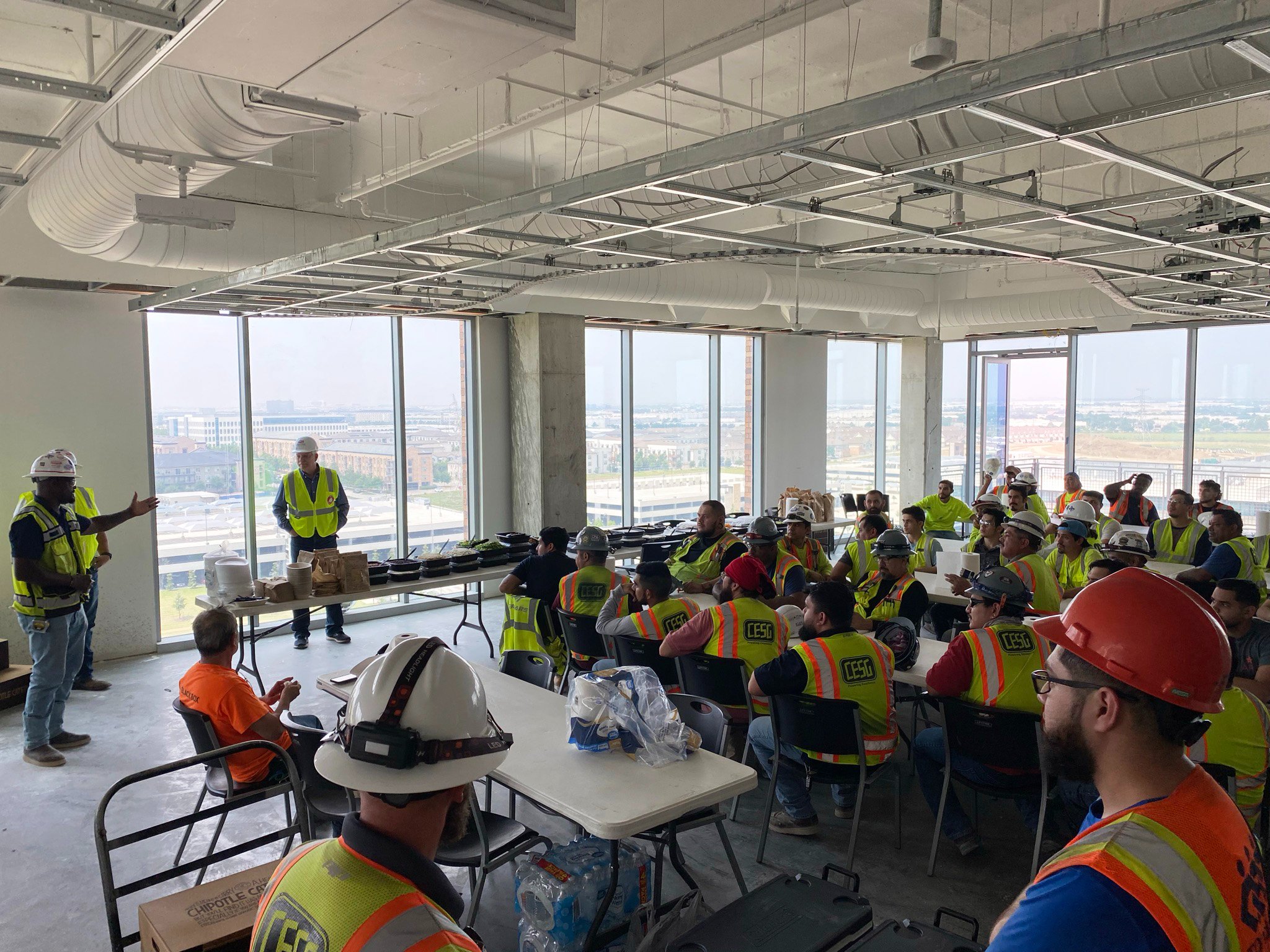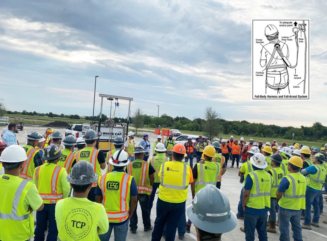 CESG participated in a safety stand down at our Tarrant County Community College project with the goal of reducing and ultimately preventing on-site injuries. The crew focused on fall hazards and the importance of fall prevention. A Personal Fall Arrest System (PFAS) consists of three major components: a full-body harness, a shock-absorbing lanyard or retractable lifeline, and secure anchors.